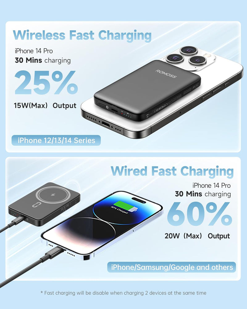 Very compact size 5000mAh Portable Charger by Romoss. Excellent powerbank to have handy when my iPhone charge is very low. The strong magnetic attraction easily connects to my iPhone. Charging with this portable charger is standard speed 'C it did not appear to be any faster or slower than a cord plugged into the wall, it took over an hour to recharge my iPhone from 25-30% charge to 100%. I can charge 2 devices simultaneously; to do so I use a USB-A to USB-C adapter on my USB-A / lightning cord to charge my iPad while my iPhone is magnetically connected and charging. Many of my devices have USB-A ports rather than USB-C ports so I need an adapter to charge any of these devices with any newer power banks that only feature USB-C device connections. Using an adapter is not difficult or inconvenient compared to the cost of a new device with a USB-C port. This portable charger is a pretty compact size and lightweight to carry with me in a sling bag; this is definitely worth having on me when my iPhone or iPad has a very low charge.