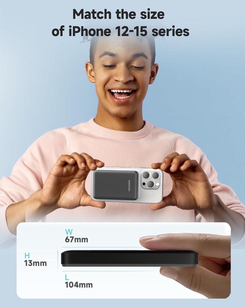 Portable Charger 5000mAh Power Bank: This portable charger offers a high-capacity 5000mAh battery, perfect for keeping your iPhone and other devices powered all day. It supports wireless magnetic charging for iPhone 12 to 16 series and wired charging via USB-C for other compatible devices. Whether you're traveling or on long trips, this power bank for iPhone ensures your phone stays fully charged.