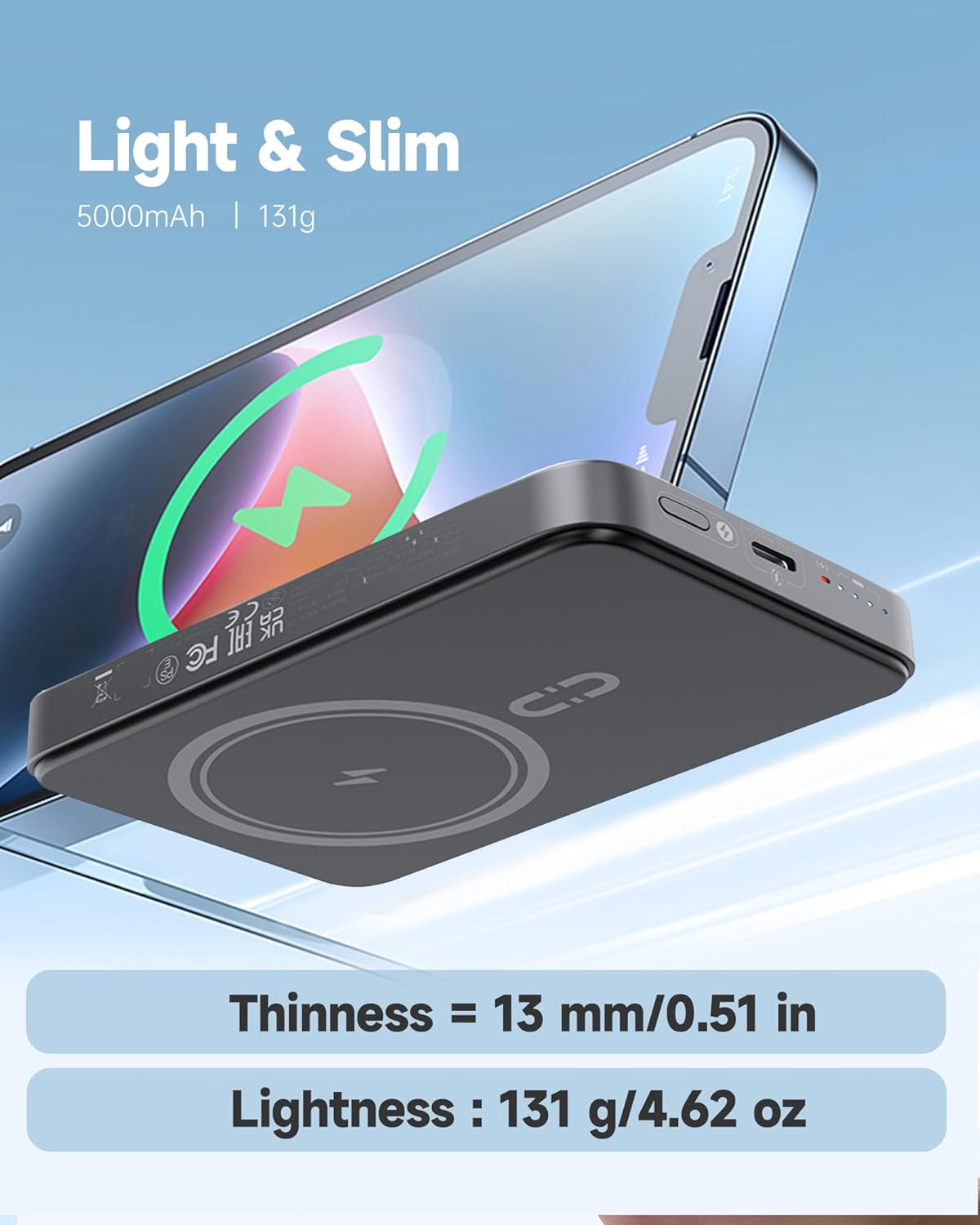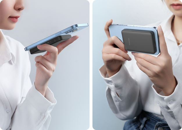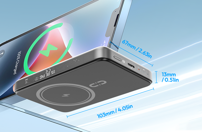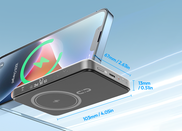 At just 0.79 inches thick, this slim and lightweight magnetic wireless portable charger easily fits in your pocket, backpack, or purse without adding extra weight.